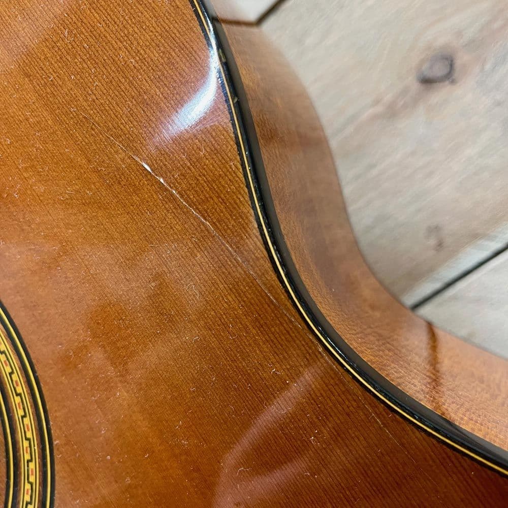 This guitar features small dings on the body and headstock and also a crack in the top near the soundhole. We have had this crack evaluated and it does not appear to be of any structural concern. A previous owner has painted white fret position markers onto the side of the neck. This is shown in the photos.